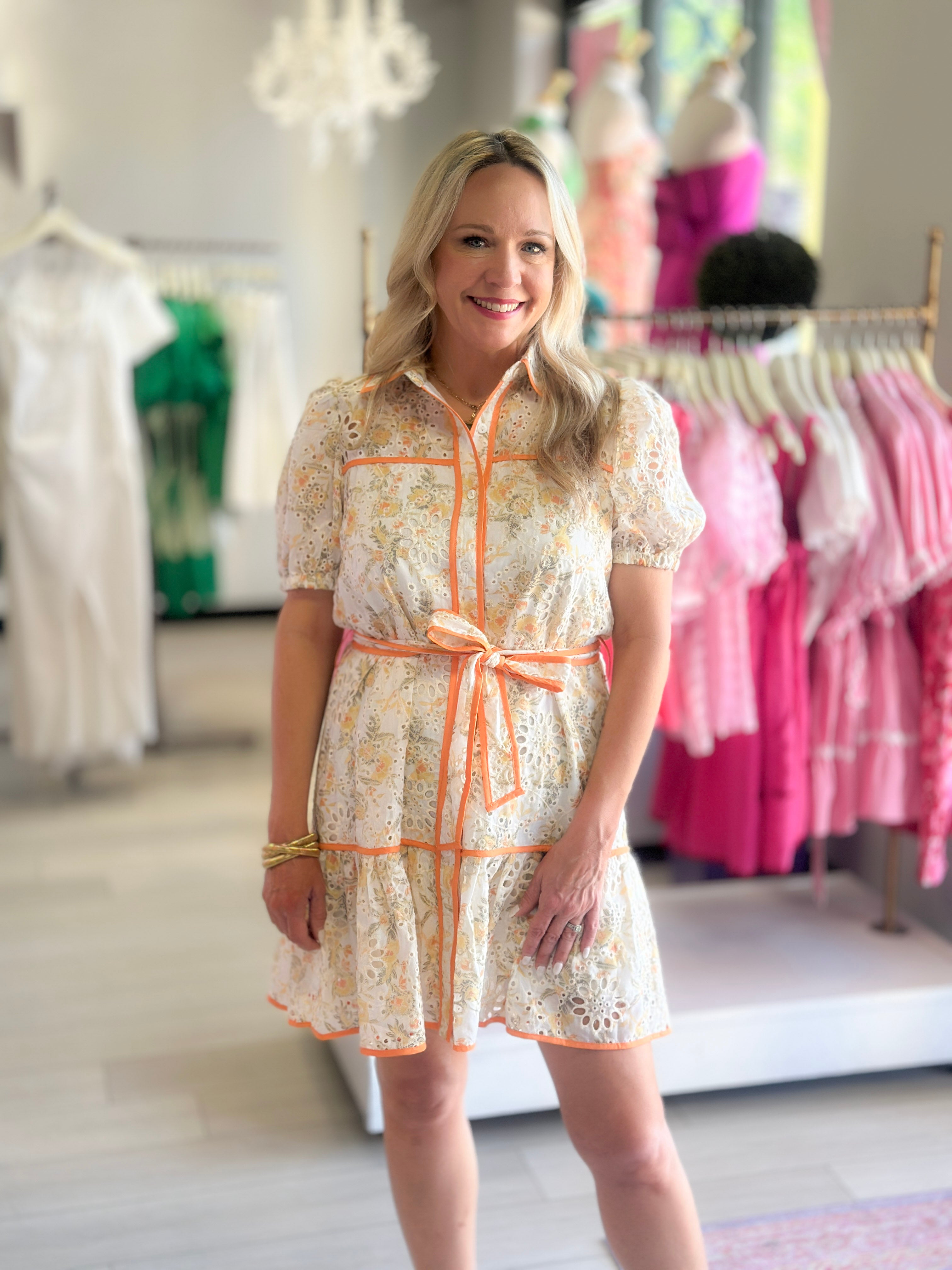 Get yourself glam with this fab floral dress in gold tones! It's got a tie belt waist for that perfect waist cinch.