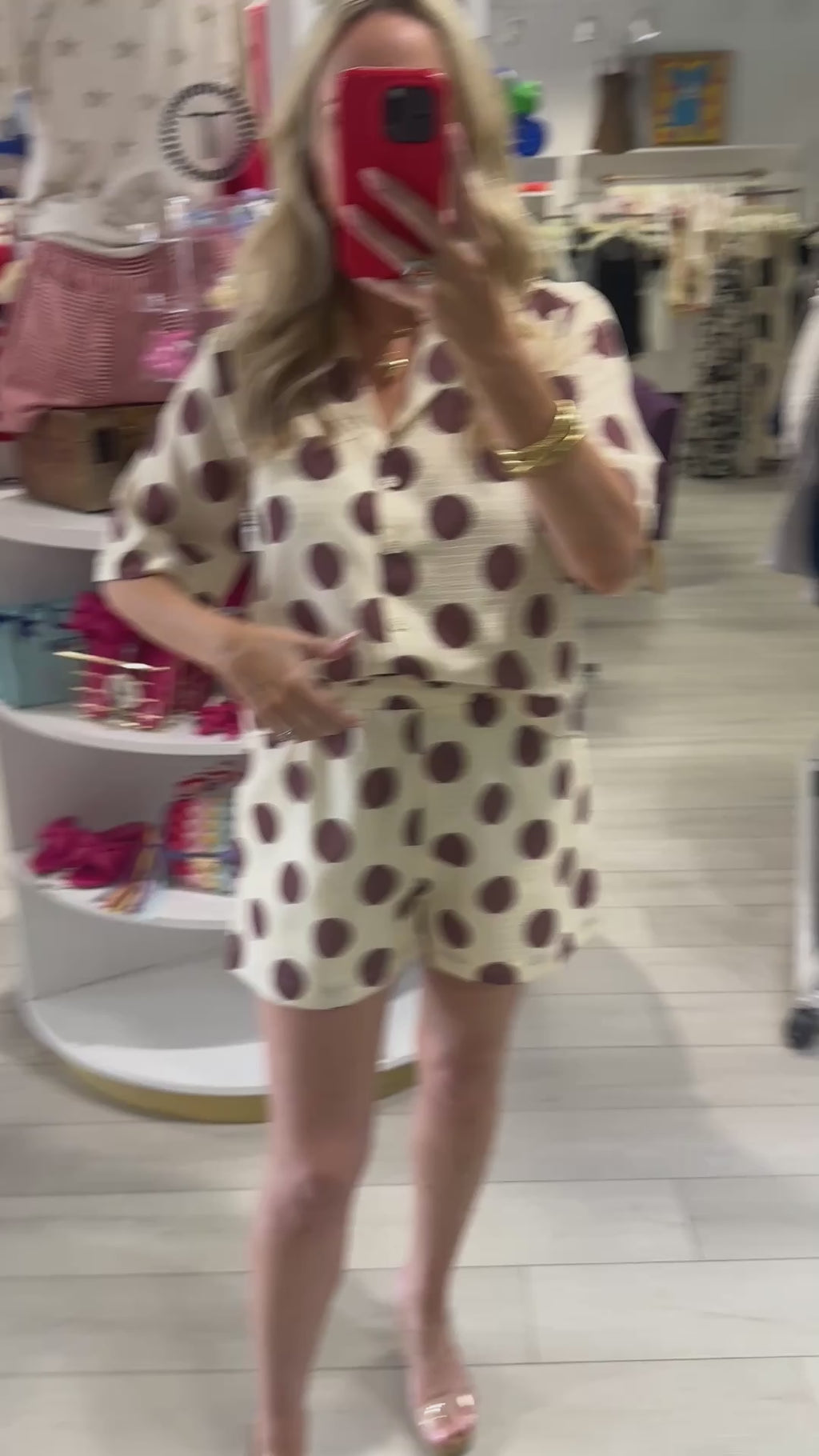 This playful top features charming brown dots scattered over a creamy background, creating a fun and fresh look. Short sleeves and a classic collared neck with a button-down front add a touch of casual style. Pair it with the matching shorts for an adorable set.