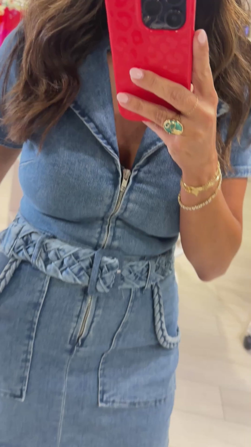 Step out in style with the Today Feels Denim Dress, featuring a medium denim shade perfect for any laid-back look. The zip-up collared neck adds a touch of sporty chic, while short sleeves keep it cool and casual. Play with the braided belt and belt loops to define your waist, and rely on the handy front utility pocket for stashing your essentials with flair. Ready for whatever the day brings!