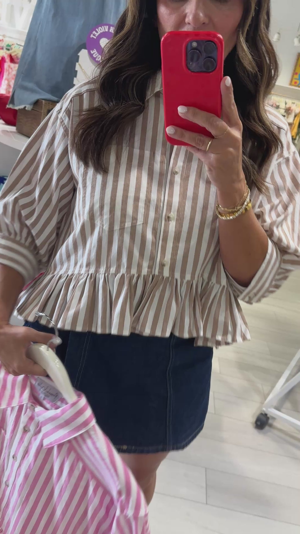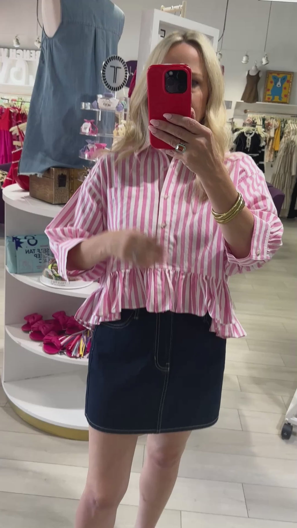 Add a fun twist to your wardrobe with the Harley Stripe Blouse. This cropped, boxy shirt features playful 3/4 sleeves and a charming bottom ruffle that adds a flirty flair. Perfect for mixing and matching, it brings a breezy, stylish vibe to any outfit.