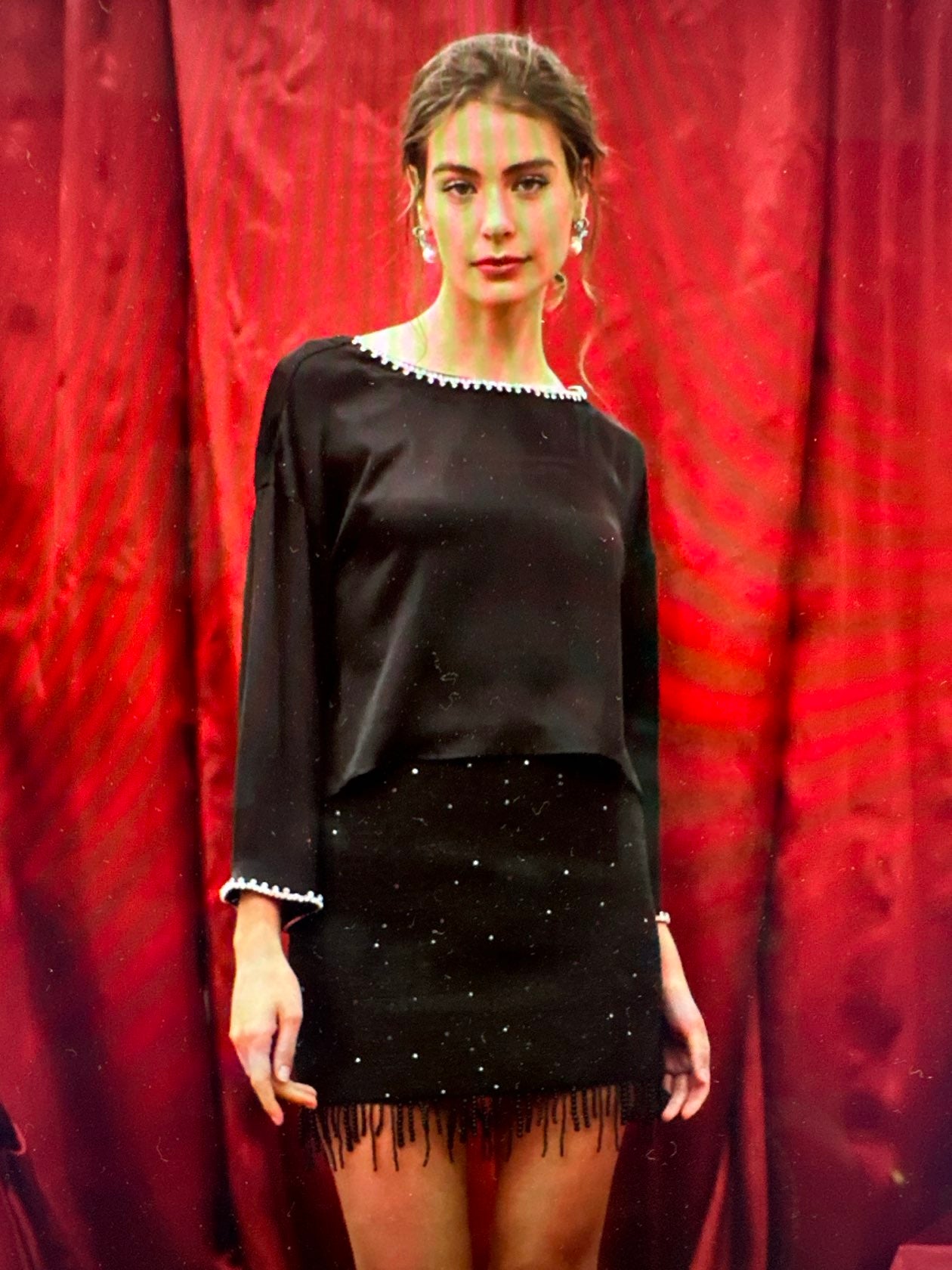 Get ready to shine in style with our Enticing Shine Top! This black satin top is adorned with glimmering rhinestone trim, making it perfect for any occasion. Add a touch of glamour to your wardrobe and turn heads wherever you go.