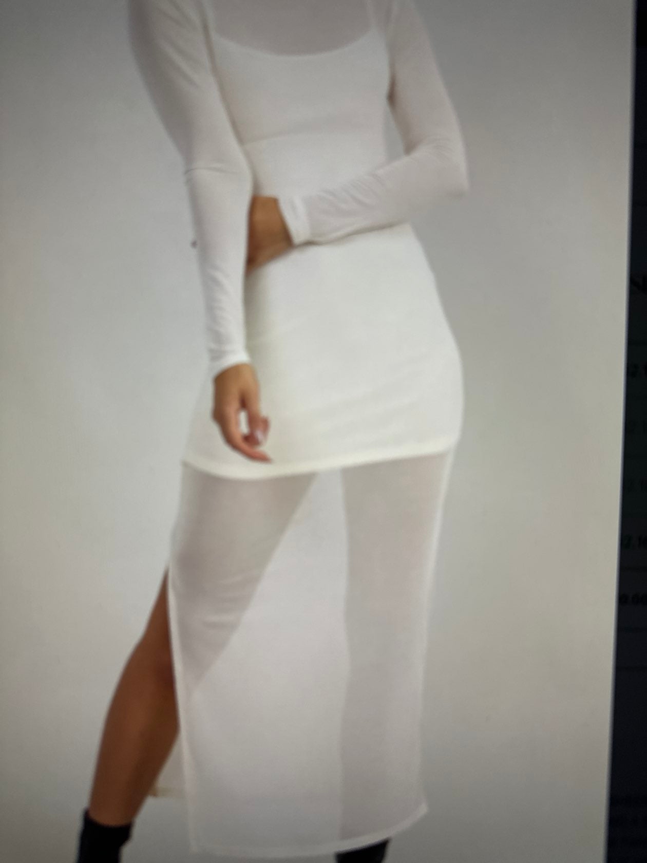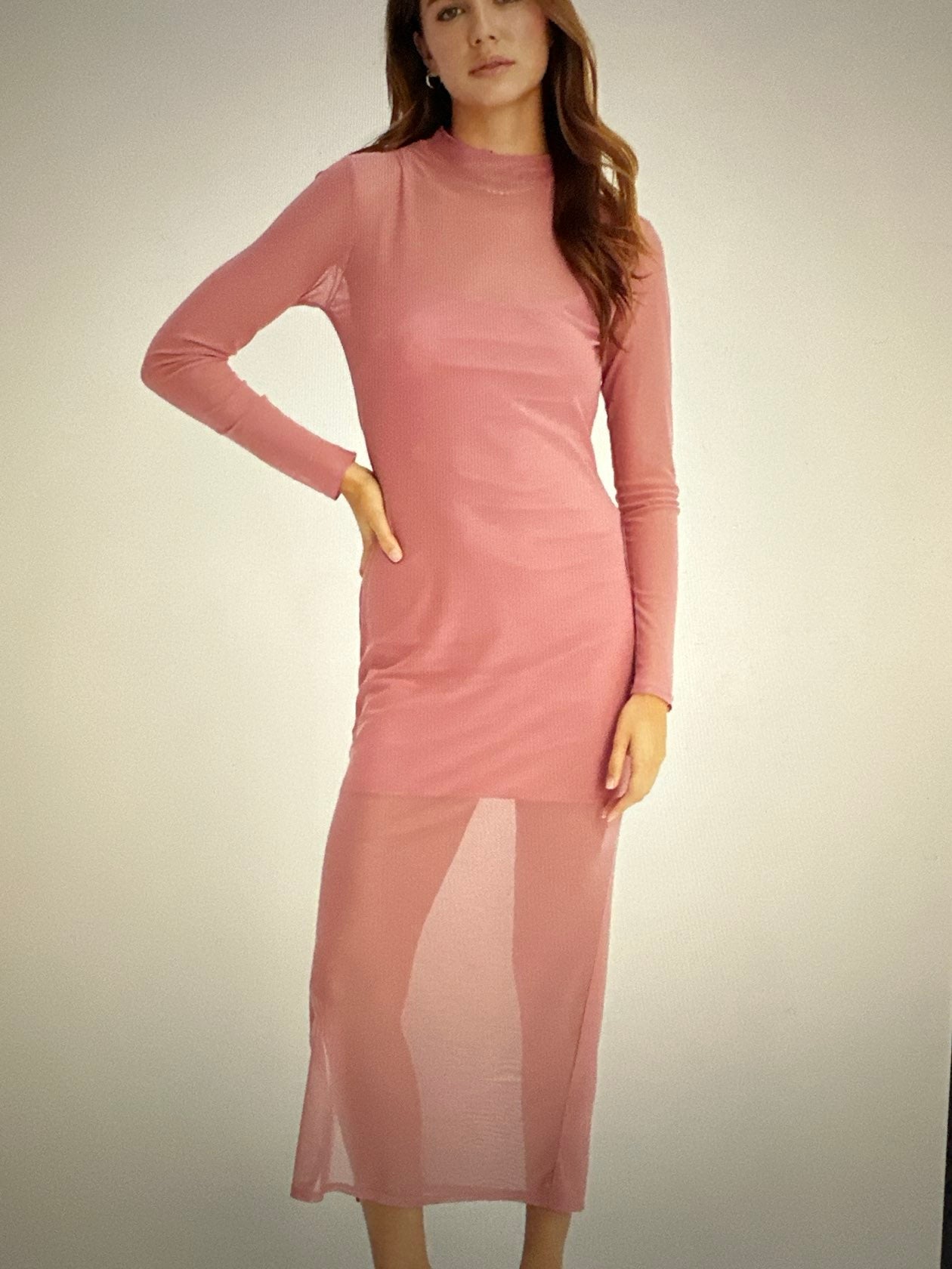 Elevate your style with the Honestly Love You Midi. This elegant dress features a body-hugging underlay and a sheer mesh long-sleeve top, offering a modern twist to classic elegance. The high neckline and side slit add a touch of sophistication, perfect for evening events and night outs. Complete the look with your favorite heels or flats.